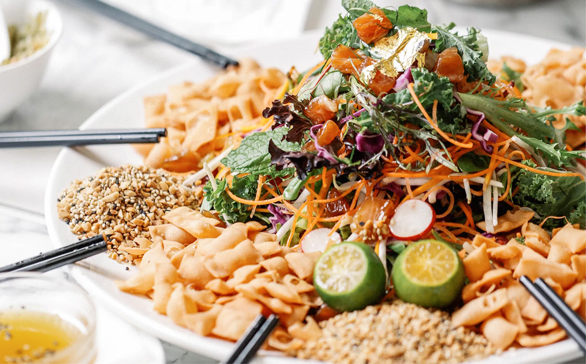 Singaporeans love to eat. During Lunar New Year, just as inescapable as pineapple tarts and bakkwa (sweet pork jerky) are the endless servings of yeesang (鱼生). At the start of each meal, everyone gathers round the table for lohei (捞起), where the salad of raw fish, shredded vegetables and crispy crackers is tossed into the air with chopsticks while auspicious sayings are uttered enthusiastically. The higher the toss, the greater the luck!